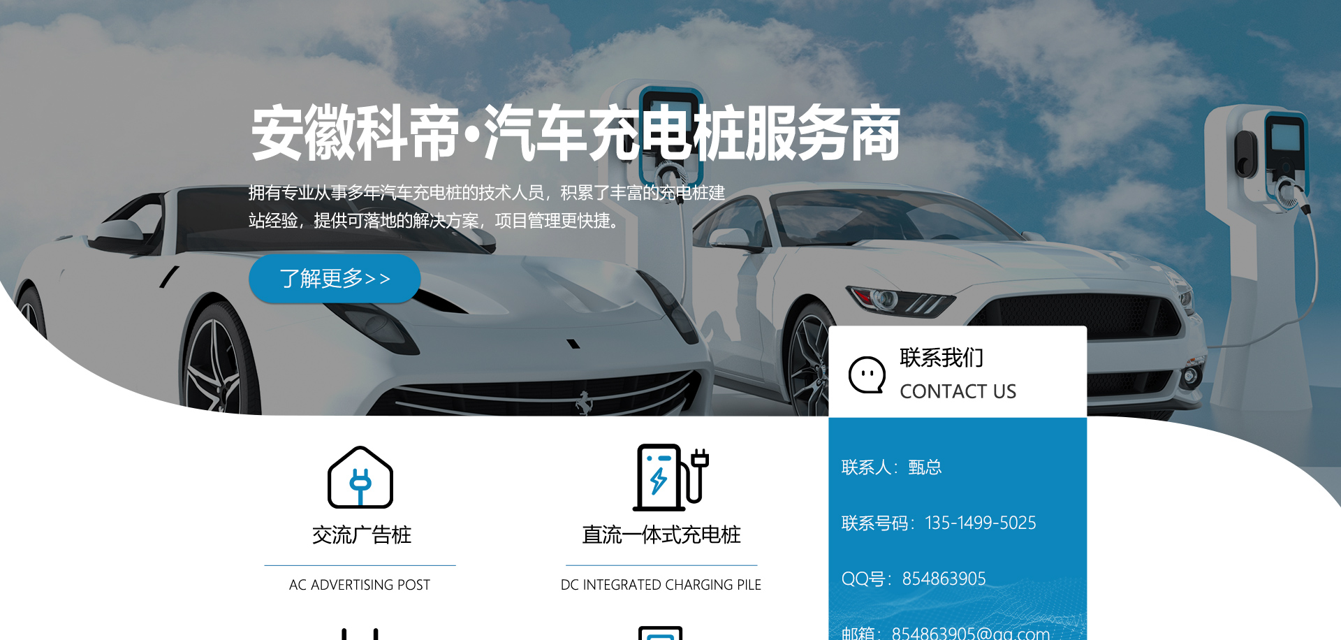 關(guān)于我們安徽科帝新能源科技有限公司坐落于安徽省會(huì)-合肥,是一家研發(fā)、生產(chǎn)智能充電樁設(shè)備,汽車充電站后臺(tái)監(jiān)控管理系統(tǒng)和生產(chǎn)高壓開關(guān)設(shè)備的企業(yè).由專門的研發(fā)團(tuán)隊(duì)、管理團(tuán)隊(duì)按照現(xiàn)代化企業(yè)制度規(guī)范設(shè)立的有限責(zé)任公司。致力于為能源智能、安全的應(yīng)用和節(jié)能減排提供整體的技術(shù)與產(chǎn)品解決方案。科帝集研發(fā)、設(shè)計(jì)、生產(chǎn)、銷售以及服務(wù)于一體,在電動(dòng)汽車充電方案,充電設(shè)施建設(shè)和城市配電方面擁有廣泛的技術(shù)研究及經(jīng)驗(yàn)積累,為客戶提供安全、智能的充電設(shè)備及充電運(yùn)營(yíng)站建設(shè)一體化解決方案。并堅(jiān)持以人為本、質(zhì)量為先、顧客至上、不斷創(chuàng)新”的企業(yè)理念,為能源行業(yè)的發(fā)展、節(jié)能減排做出重大的貢獻(xiàn)。公司擁有豐富的產(chǎn)品種類,目前科帝已研發(fā)生產(chǎn)了三十多種產(chǎn)品,充電設(shè)備有直流一體式充電樁、直流分體式充電樁、直流廣告樁、交流廣告樁、廣告一體樁、壁掛交直流樁;等多種充電設(shè)備;每一款產(chǎn)品都是精心打造,力求為客戶提供優(yōu)越的用戶體驗(yàn)。展望未來(lái)科帝將通過(guò)持續(xù)的自...
